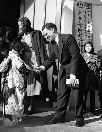 Jacob DeShazer Greets Youngster - 1949<p>DeShazer greets a young member of his Tokyo congregation in January 1949. He embraced the Christian faith after reading a Bible given to him by a guard while in prison. He vowed that if he were ever freed, he would share what he had learned with the Japanese. Description from the LA Times.</p>